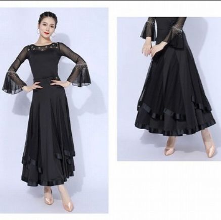 社交ダンス トップス スカート 2点セット 黒 ブラック M 女性 レディース ダンス衣装 長袖 上品 フリル モダン ラテン ワルツ チャチャチャ 練習着 競技着 ステージ イベント 発表会 dm 111 x 2