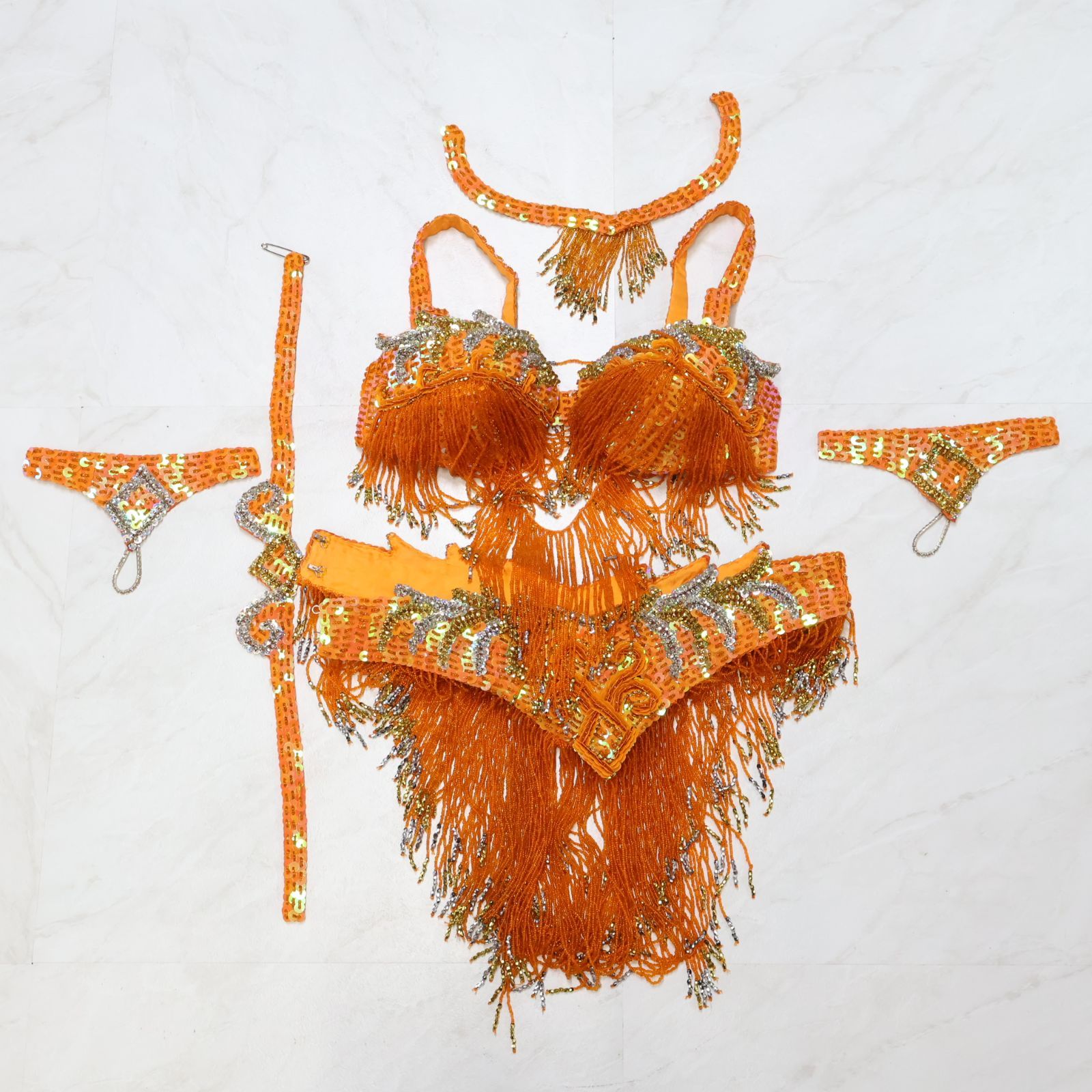 ベリーダンス用 オリエンタル衣装 オレンジ スパンコールラメ×ビーズ 多数付き 豪華 重量感 輝き 煌びやか お洒落 鮮やか トップス ベルト セット ダンスウェア エスニック 小物 ダンス レディース アラビア アフリカン