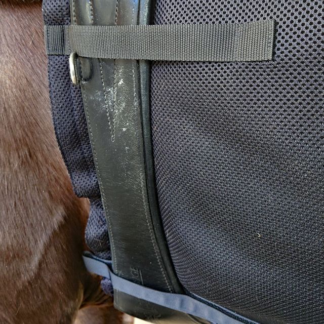 鞍傷のできやすいキ甲や背中が大きく空いたデザインですので、穴あきゼッケンが必要な馬にもお使いいただけます。ゼッケンの上から装着することも可能です。