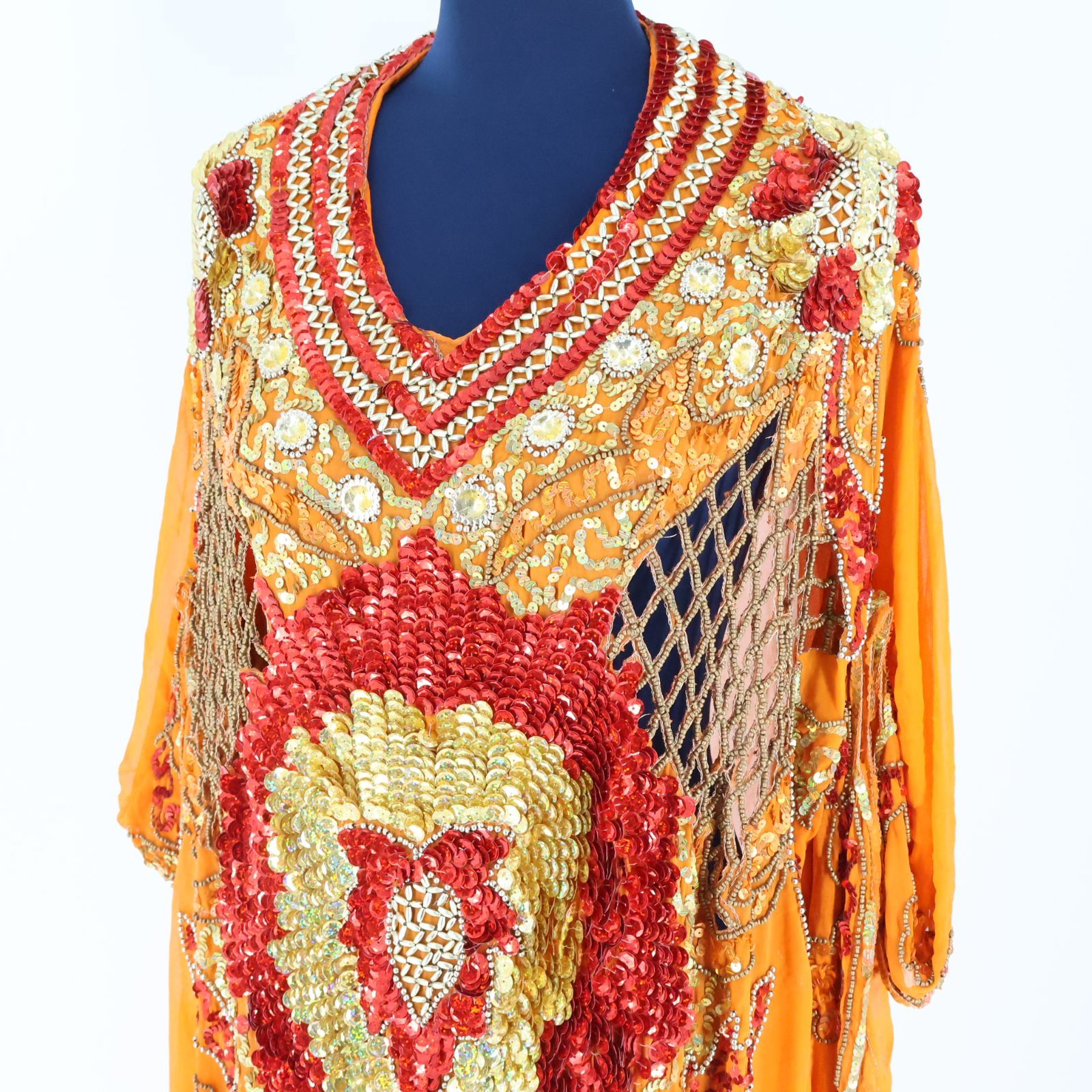 ベリーダンス用衣装 鮮やかなオレンジ ディドレス スパンコールラメ ガラベーヤ ワンピースドレス ゴールド 赤 レース
